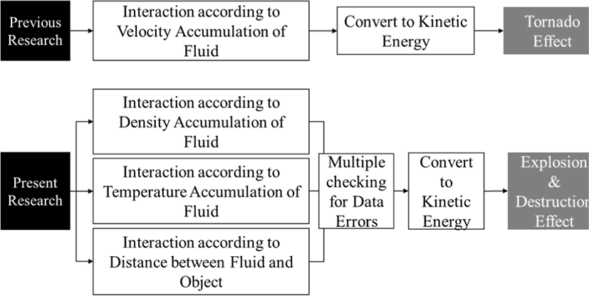 Three experiments were conducted to test methods of interlinking explosion and destruction effects by energy accumulation and conversion. The first tested the effect of interlinking the effects by fluid density, the second by temperature, and the third by the distance between the fluid and relevant objects. In Experiment 1 using fluid density, some objects did not move because the fluid dissipated, so Experiment 2 was conducted using temperature. In Experiment 2, voxels had incomplete information because turbulence caused the fluid to have irregular motion, so Experiment 3 was conducted using the distance between the fluid and relevant objects. In conclusion, three experiments were conducted to determine the effectiveness of different methods of interlinking explosion and destruction effects. The overall experimental process is shown in Fig. 12.