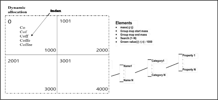 In entire process, the blank exception handling of the received value will preferentially. Handling can be supported by program was used. And also system will return value as no spaces from insertion. For example, When “아~~~이스” (In English, I~~~ce) entered into the system, system will recognize as “아이스” with no spaces. The system has main constraint from insertion. The entire insertion of synonyms, system must collect at least two cases from insertion. When “커피” (In English, Coffee) entered into the system, the system will represent entire categories related with coffee. And also system will returned as “Smoothies”, “Lattés”,” Frappuccino, etc.” so user can perceivable their purposes. To do synonyms method, Algorithms classified into 4 cases “A.M.E.R.I.C.A.N.O” into 4 cases. “A.M.E”, “A.M.E.R.I”, “A.M.E.R.I.C.A”, “A.M.E.R.I.C.A.N.O”. When system continued to erase 4 cases, system will extract until “C.A.N.O”. Because, that is irregular data from user’s insertion. In this research, the system highly recommend to avoiding irregular data. It depends on Server’s accurate result value can be derived based on high perception. To do further algorithms on other methods, system will tried to find patterns from data. The patterned data always saved in Mass Map as shown in Fig. 6. The main reason for find data will be “collect information of the Object (target).”